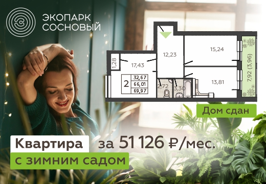 Приобретите двухкомнатную квартиру с собственным зимним садом всего за 51 126 рублей в месяц и окунитесь в мир покоя и гармонии.