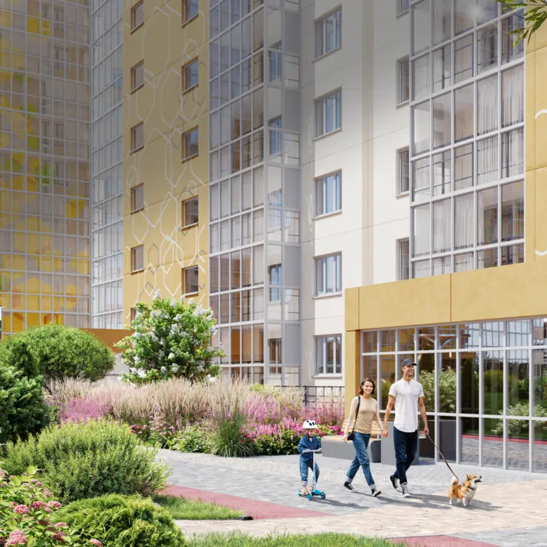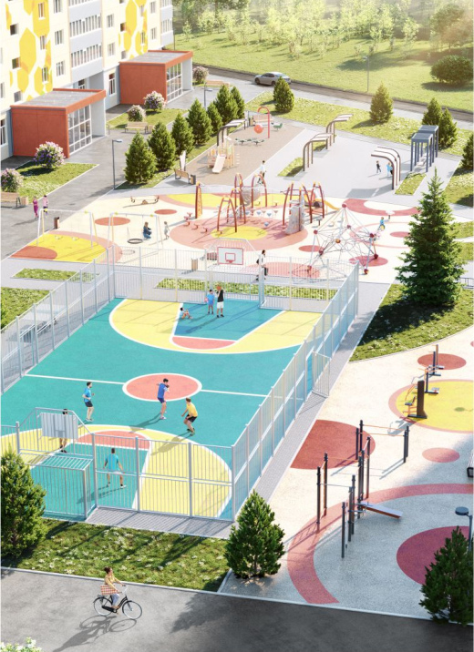 Просторные дворы с затейливыми и при этом безопасными малыми игровыми формами для детей разных возрастов. Оборудованные под ключ футбольные и баскетбольные площадки с возможностью заливки льдом в зимний период. Грамотная инфраструктурная планировка — детские сады, школы, магазины, аптеки, остановки — всё в шаговой доступности.