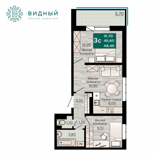 Евротрёхкомнатная Кавказская, 13, корпус 3 - Квартира №255