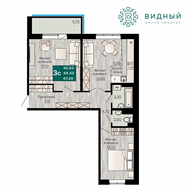 Евротрёхкомнатная Кавказская, 13, корпус 3 - Квартира №386